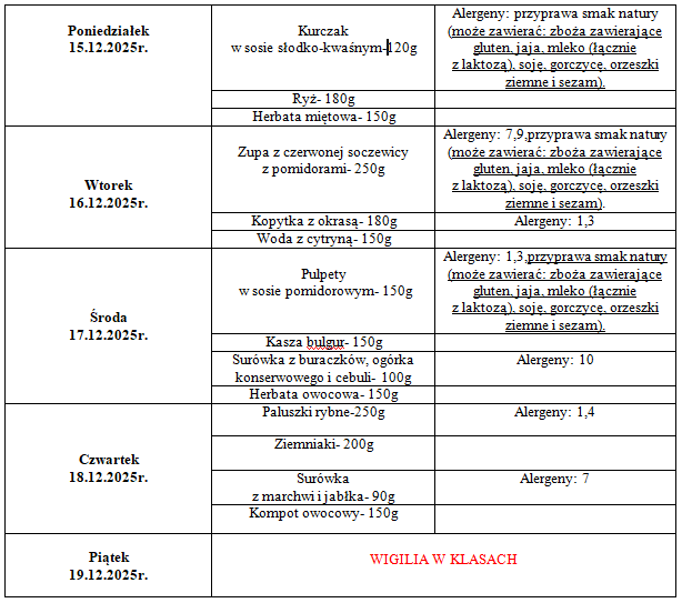 4. Jadłospis na cały tydzień znajduje się na tablicy ogłoszeń przy stołówce, oraz na stronie internetowej szkoły.