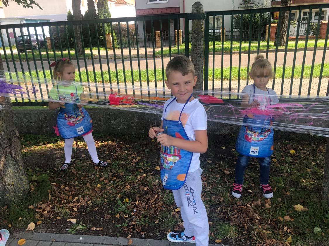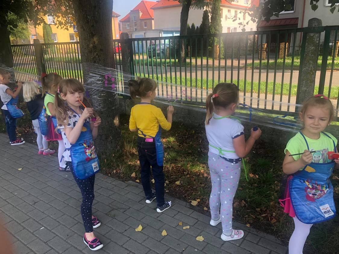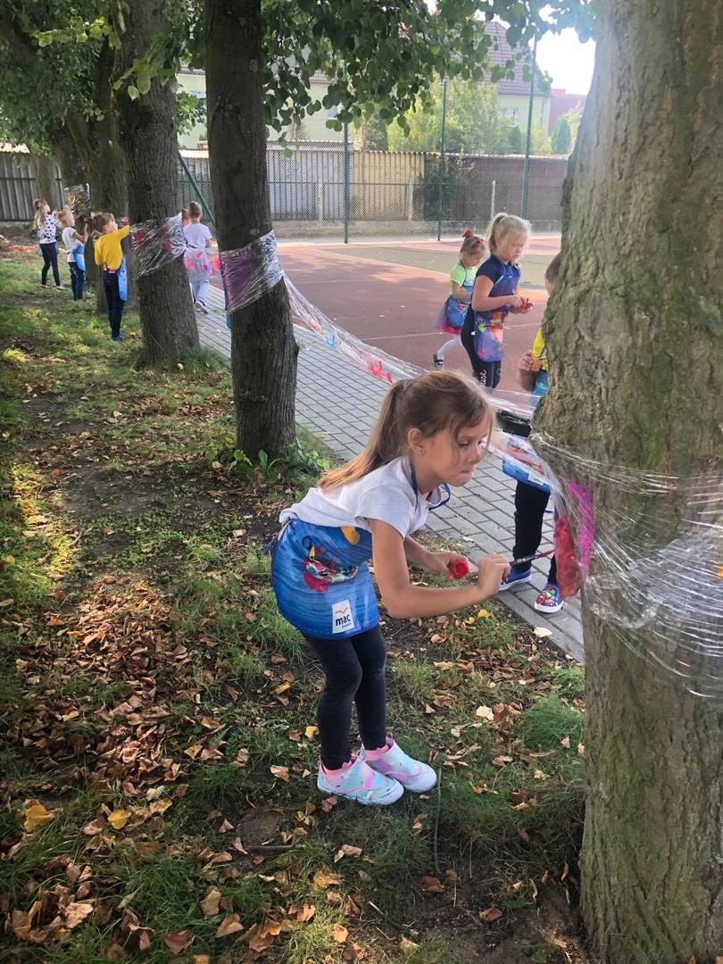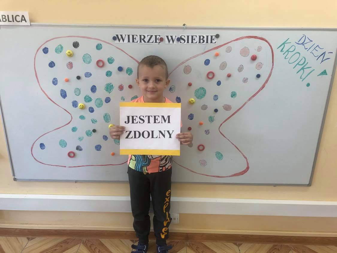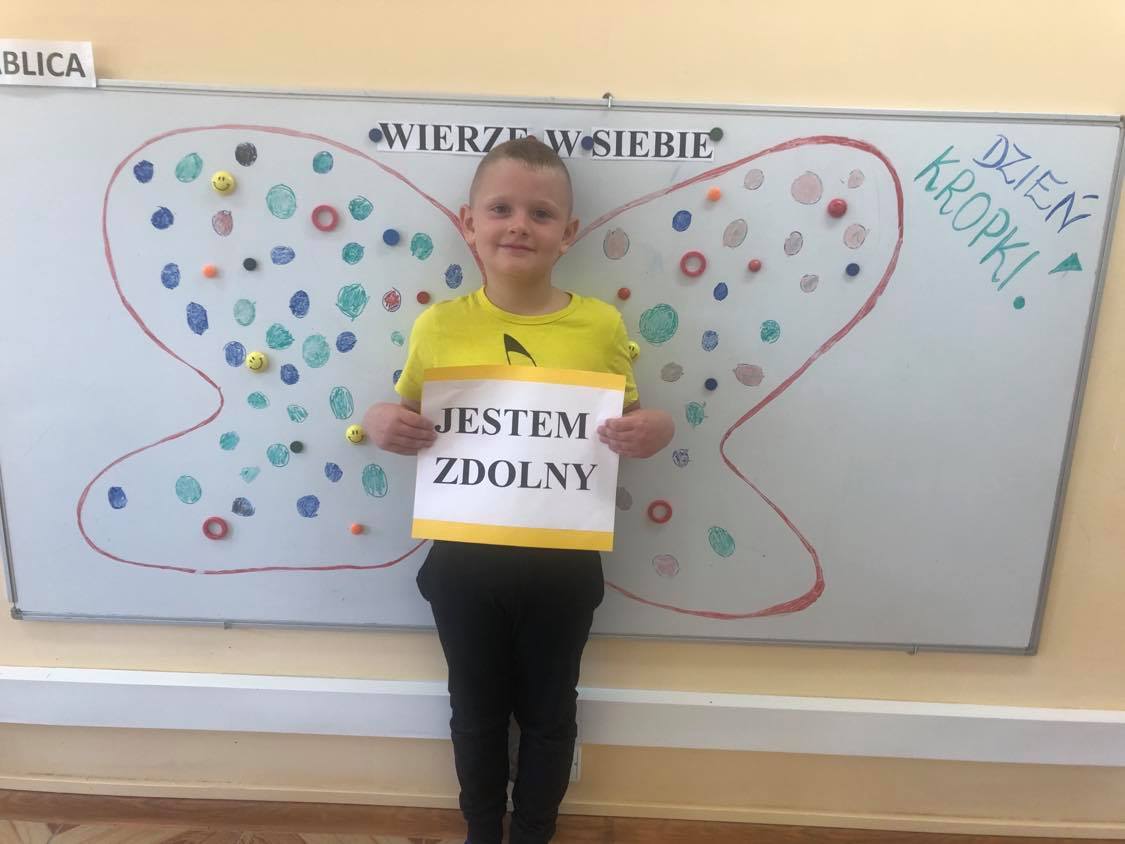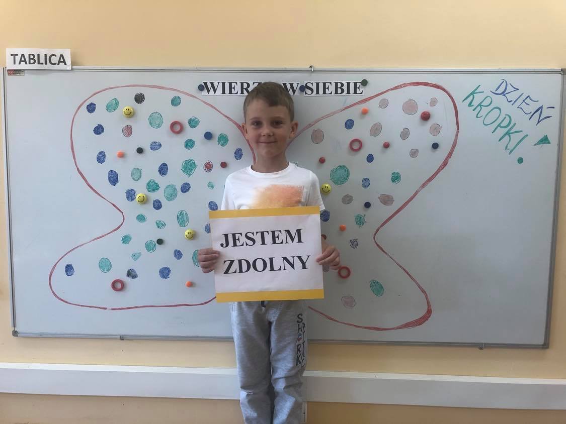 15 września w naszej szkole najmłodsi uczniowie obchodzili Międzynarodowy Dzień Kropki. Celem było wzbudzenie u dzieci kreatywności, pomysłowości i zachęcenie ich do tworzenia, działania. Dzień Kropki jest to dzień odwagi i zabawy. Na zajęciach dzieci poznały genezę tego święta. Uważnie wysłuchały opowiadania jak to zwyczajna kropka zmieniła świat małej dziewczynki o imieniu Vashti. Historia ta uświadomiła dzieciom, że każdy z nas ma jakieś ukryte zdolności – talent. Tego dnia również dostrzegaliśmy kropki tam, gdzie wcześniej nikt na nie, nie zwracał uwagi. Uczniowie bawili się przy muzyce, tańczyli, losowali tajemnicze przedmioty z worka w kropki, wykonywali kropkowane prace plastyczne oraz malowali po folii zaczepionej o drzewa.