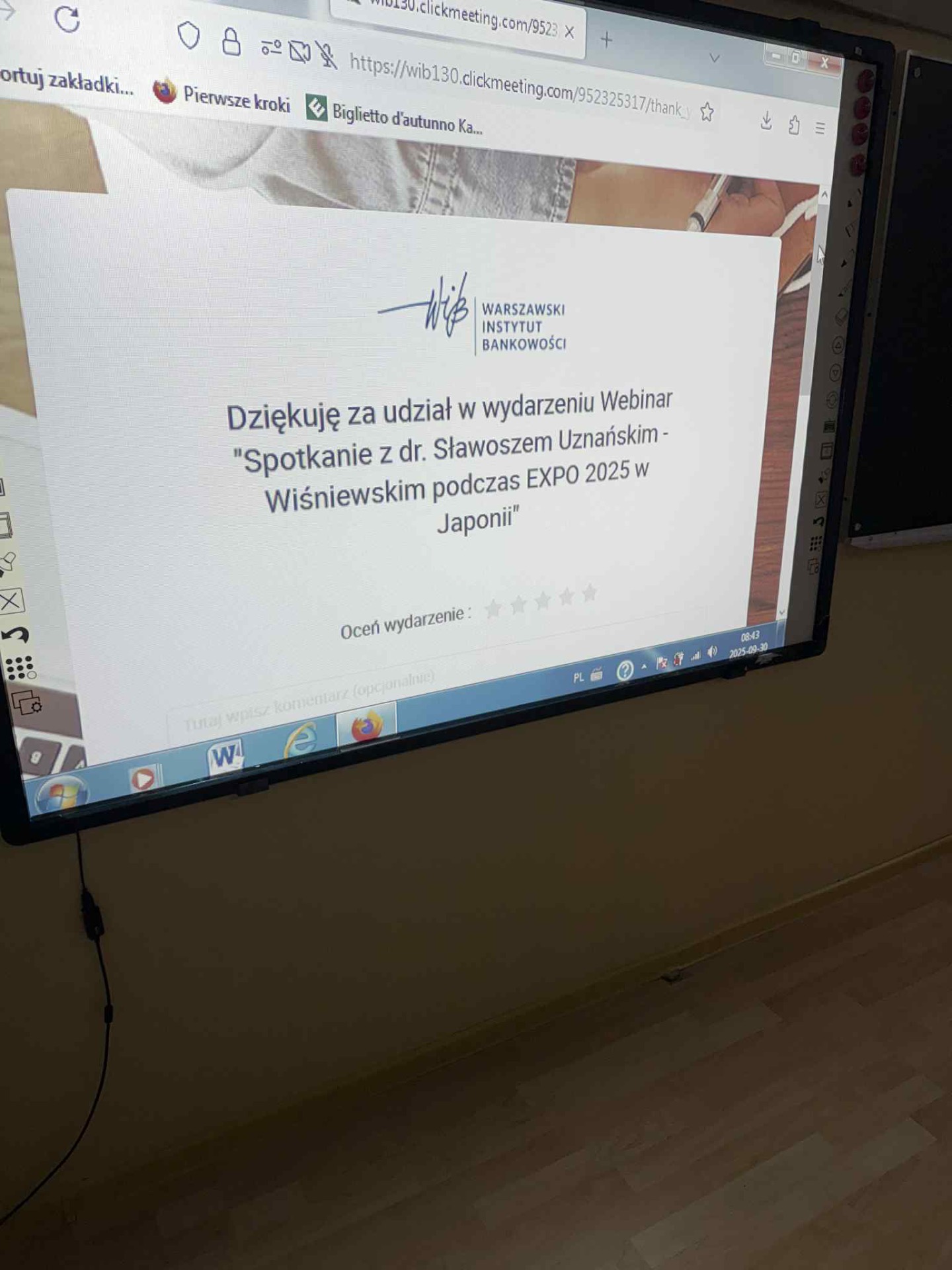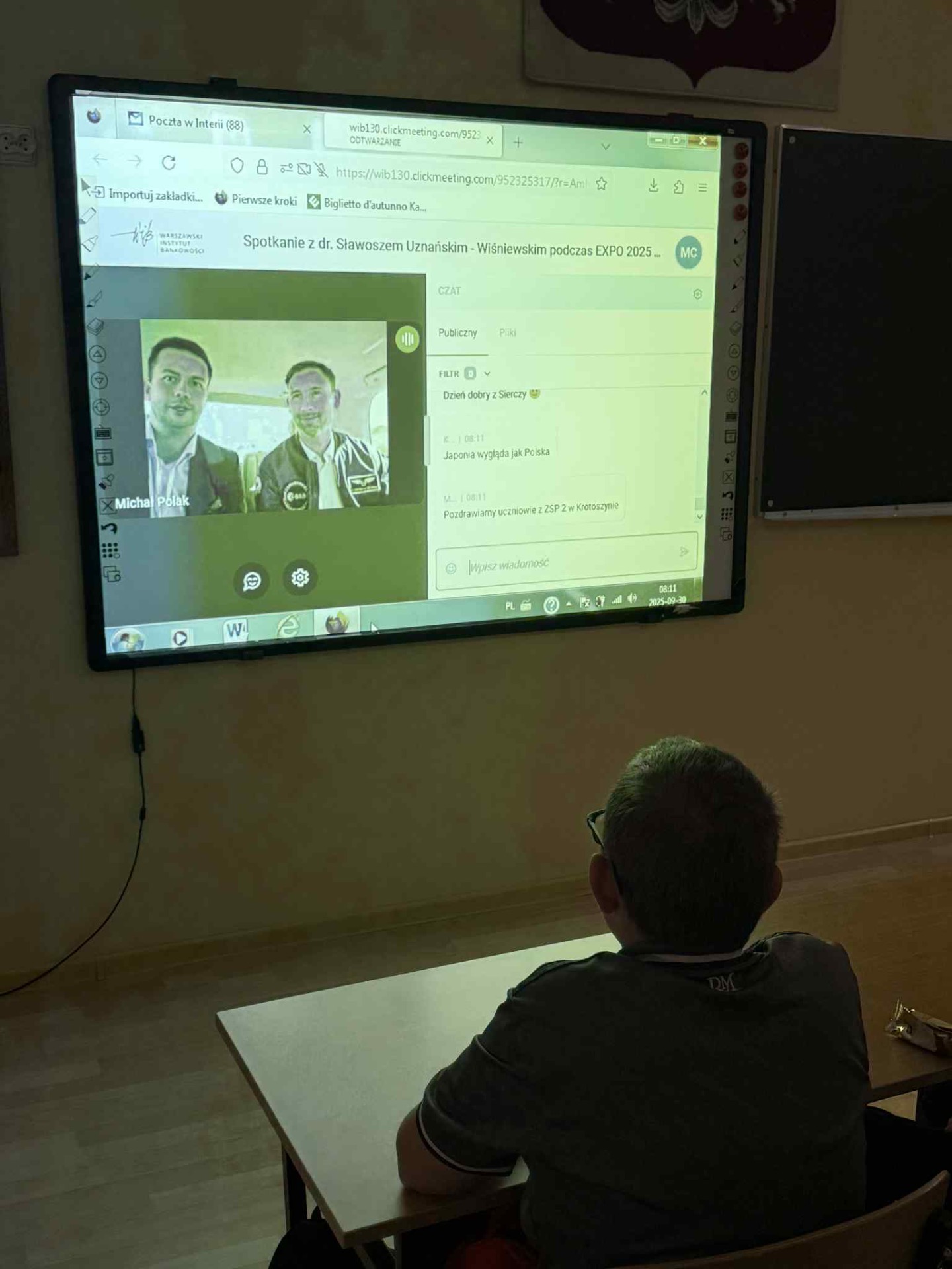 30 września uczniowie klasy 5b mieli niezwykłą okazję połączyć się online z Polskim Pawilonem Expo 2025 w Osace i uczestniczyć w spotkaniu z polskim astronautą, doktorem Sławoszem Uznańskim-Wiśniewskim.
