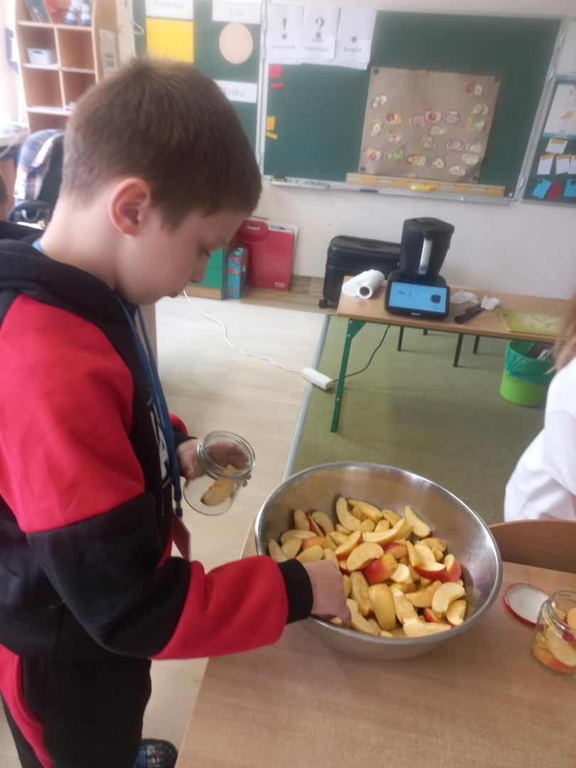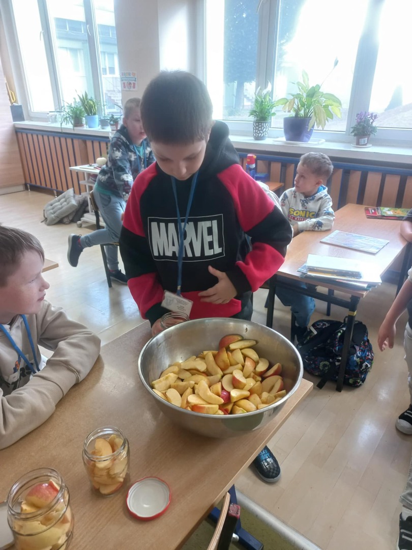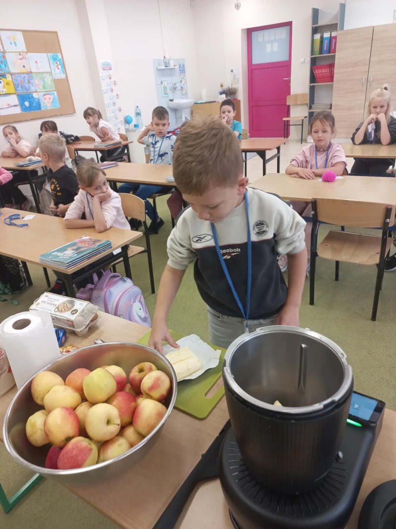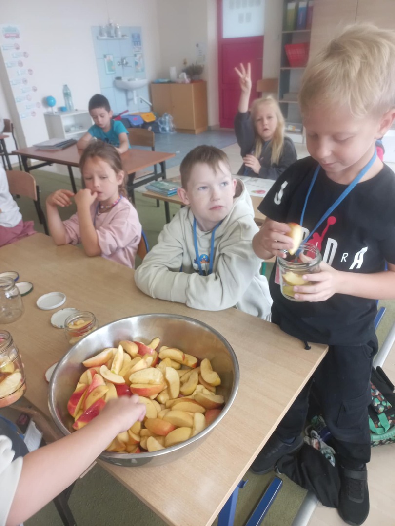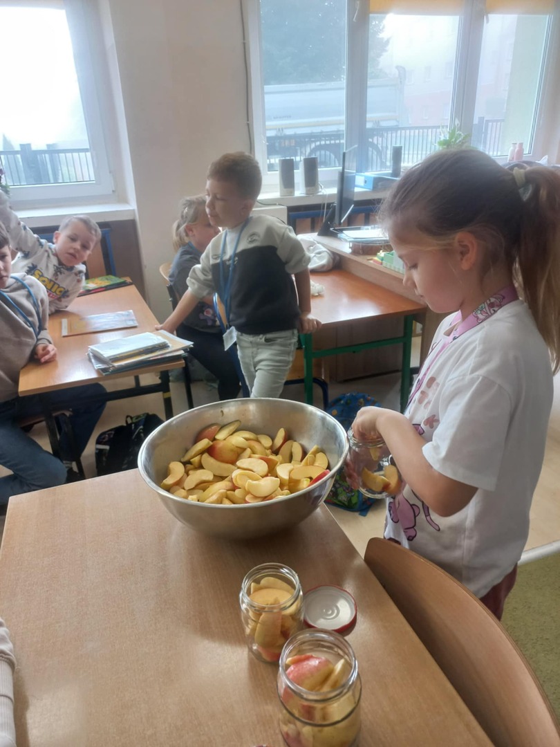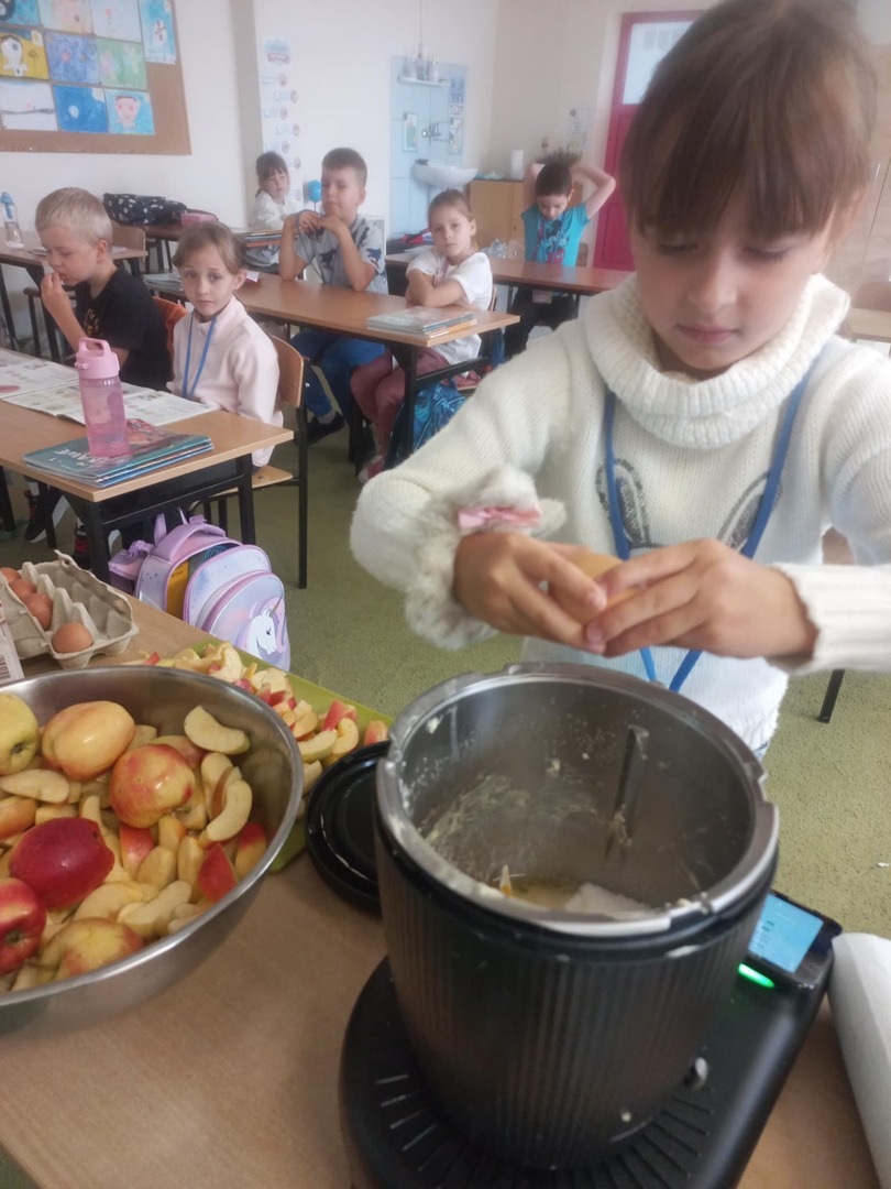 Uczniowie klasy 1a przygotowali jabłkowe kompoty oraz upiekli ciasto ucierane z jabłkami. Dzieci poprzez zabawę utrwaliły wartości nut oraz poćwiczyły matematyczne zadania, a pomogły im w tym pyszne jabłka.