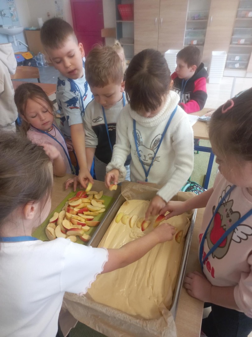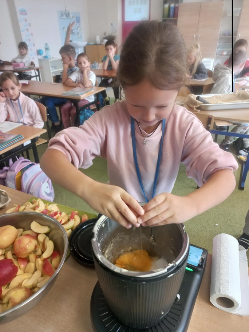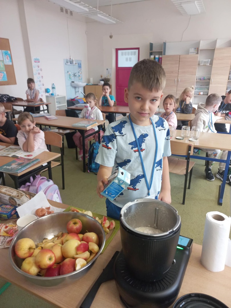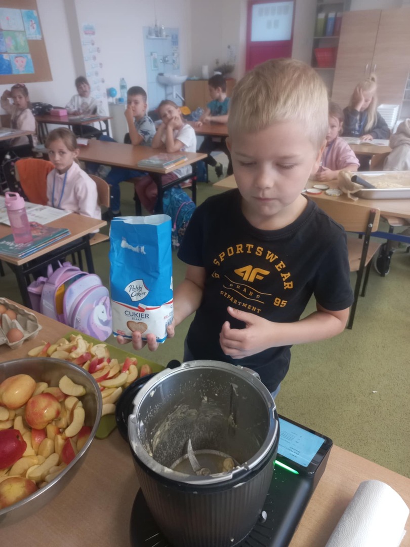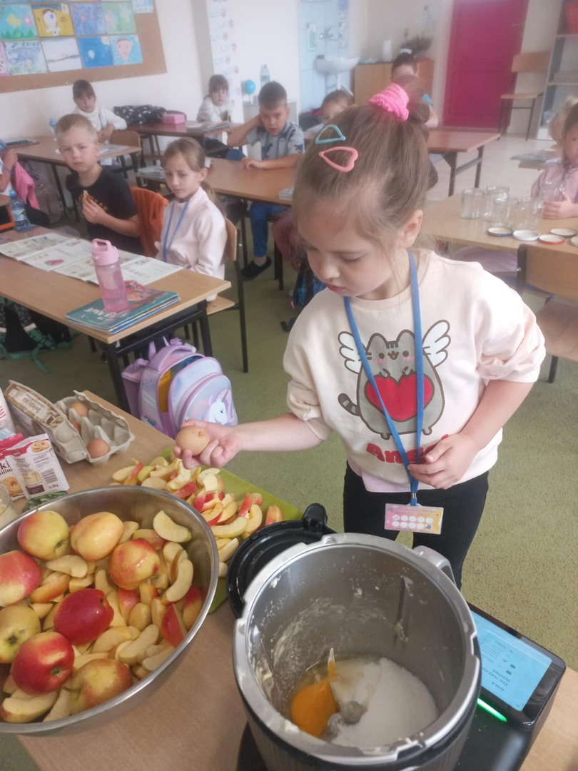 Uczniowie klasy 1a przygotowali jabłkowe kompoty oraz upiekli ciasto ucierane z jabłkami. Dzieci poprzez zabawę utrwaliły wartości nut oraz poćwiczyły matematyczne zadania, a pomogły im w tym pyszne jabłka.
