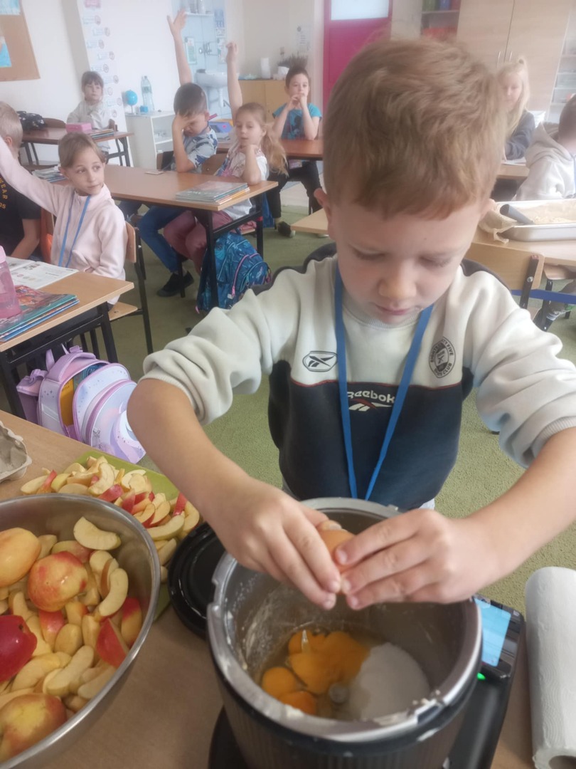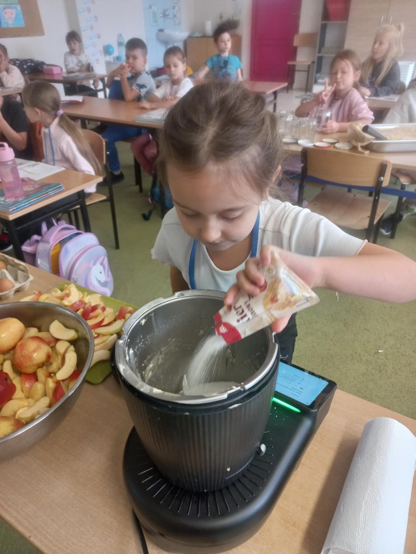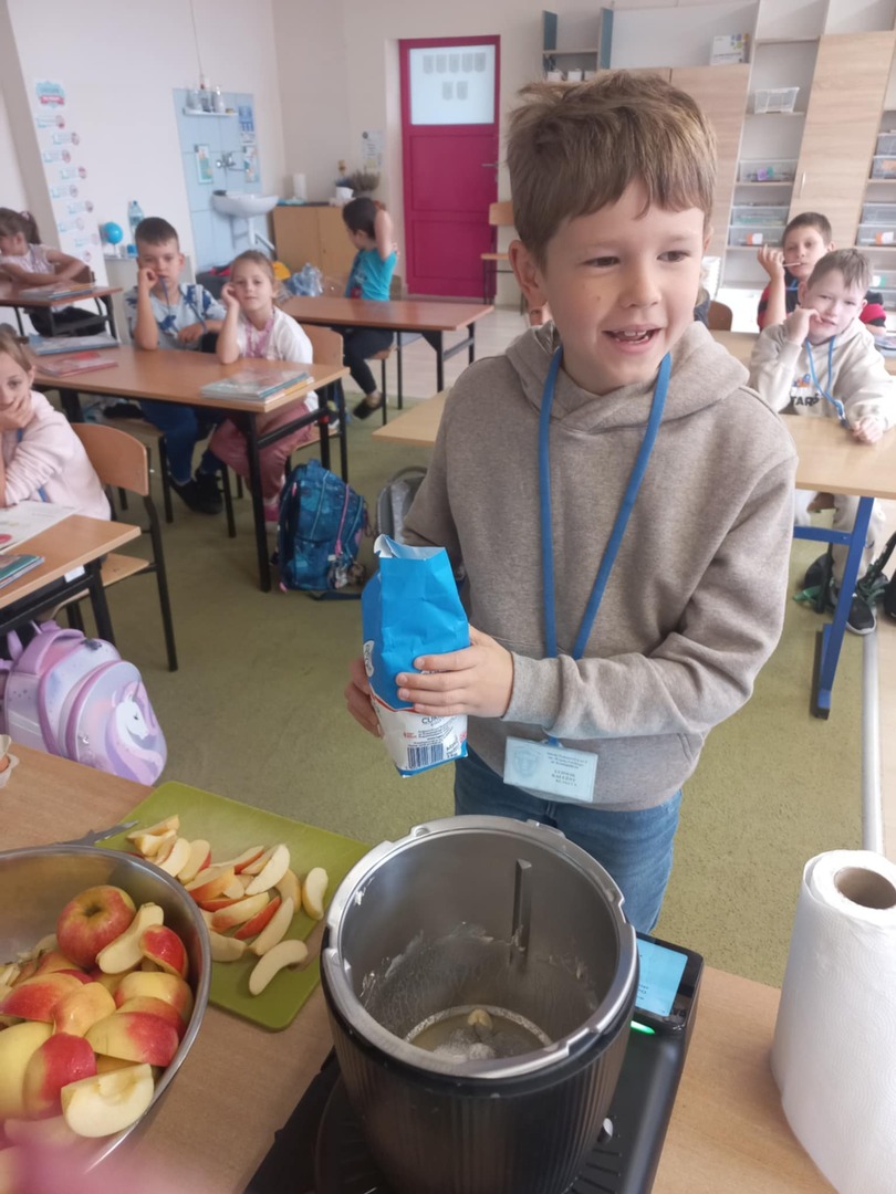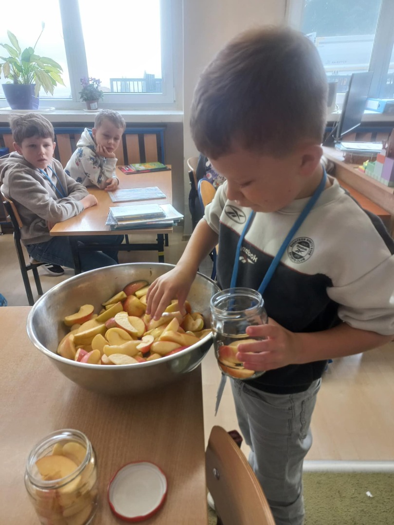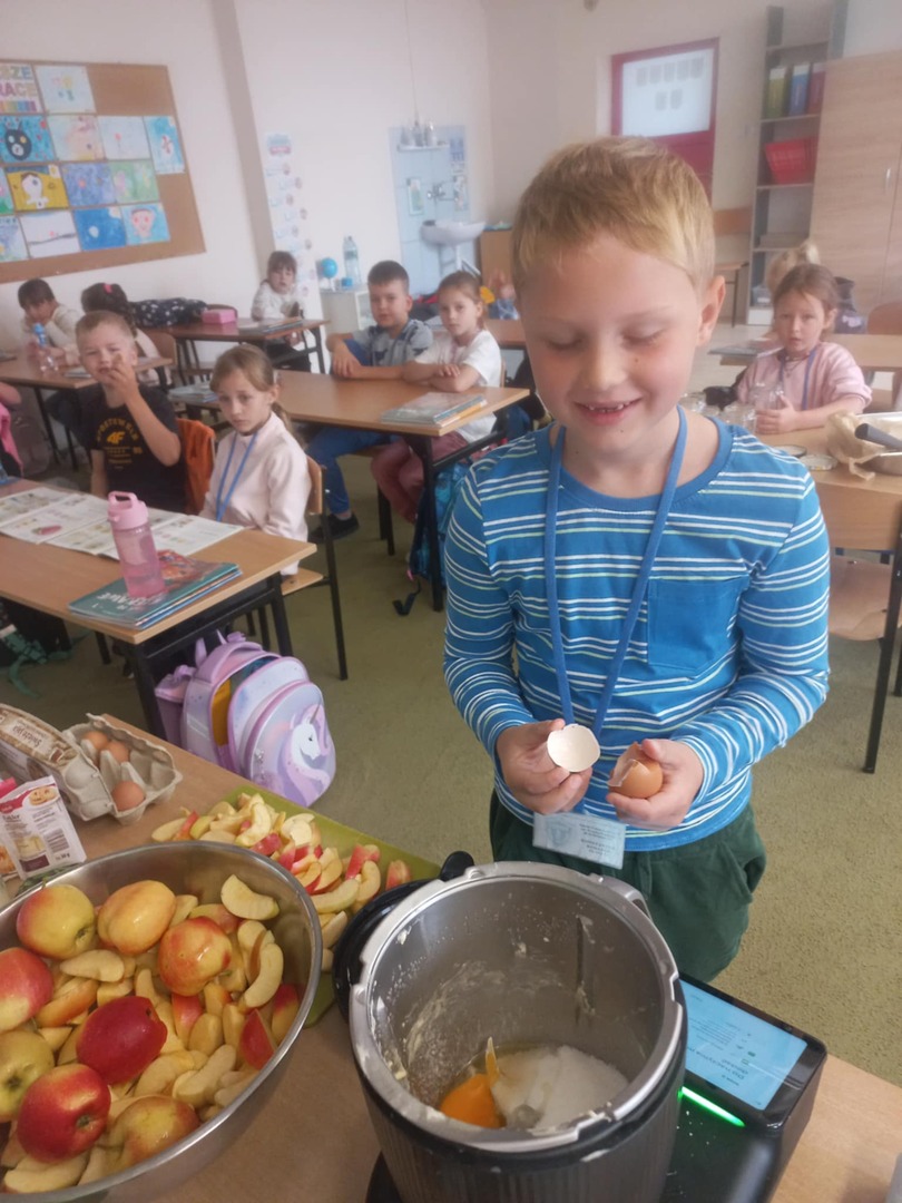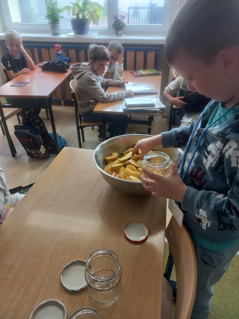 Uczniowie klasy 1a przygotowali jabłkowe kompoty oraz upiekli ciasto ucierane z jabłkami. Dzieci poprzez zabawę utrwaliły wartości nut oraz poćwiczyły matematyczne zadania, a pomogły im w tym pyszne jabłka.