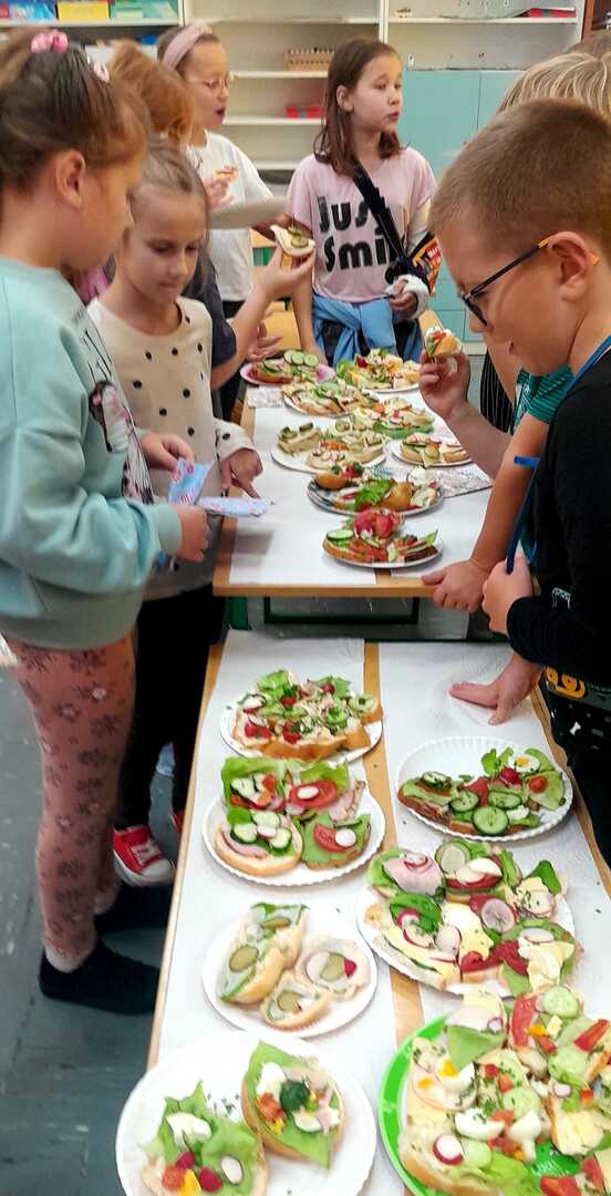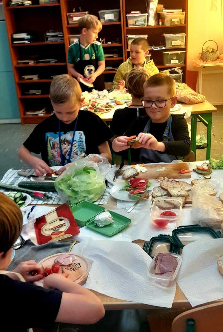 Zajęcia kulinarne były podsumowaniem lekcji o warzywach i jesieni. Miały na celu pokazanie, że przygotowywanie posiłków może być zarówno zabawą, jak i okazją do nauki o wartościach odżywczych produktów. Dzieci z zaangażowaniem komponowały swoje kanapki, wykorzystując różnorodne, kolorowe warzywa. Dzięki temu powstały prawdziwe kanapkowe arcydzieła, pełne witamin, minerałów i naturalnych barw jesieni.