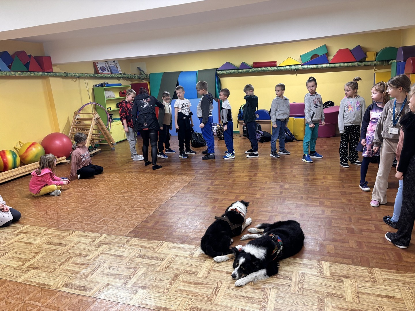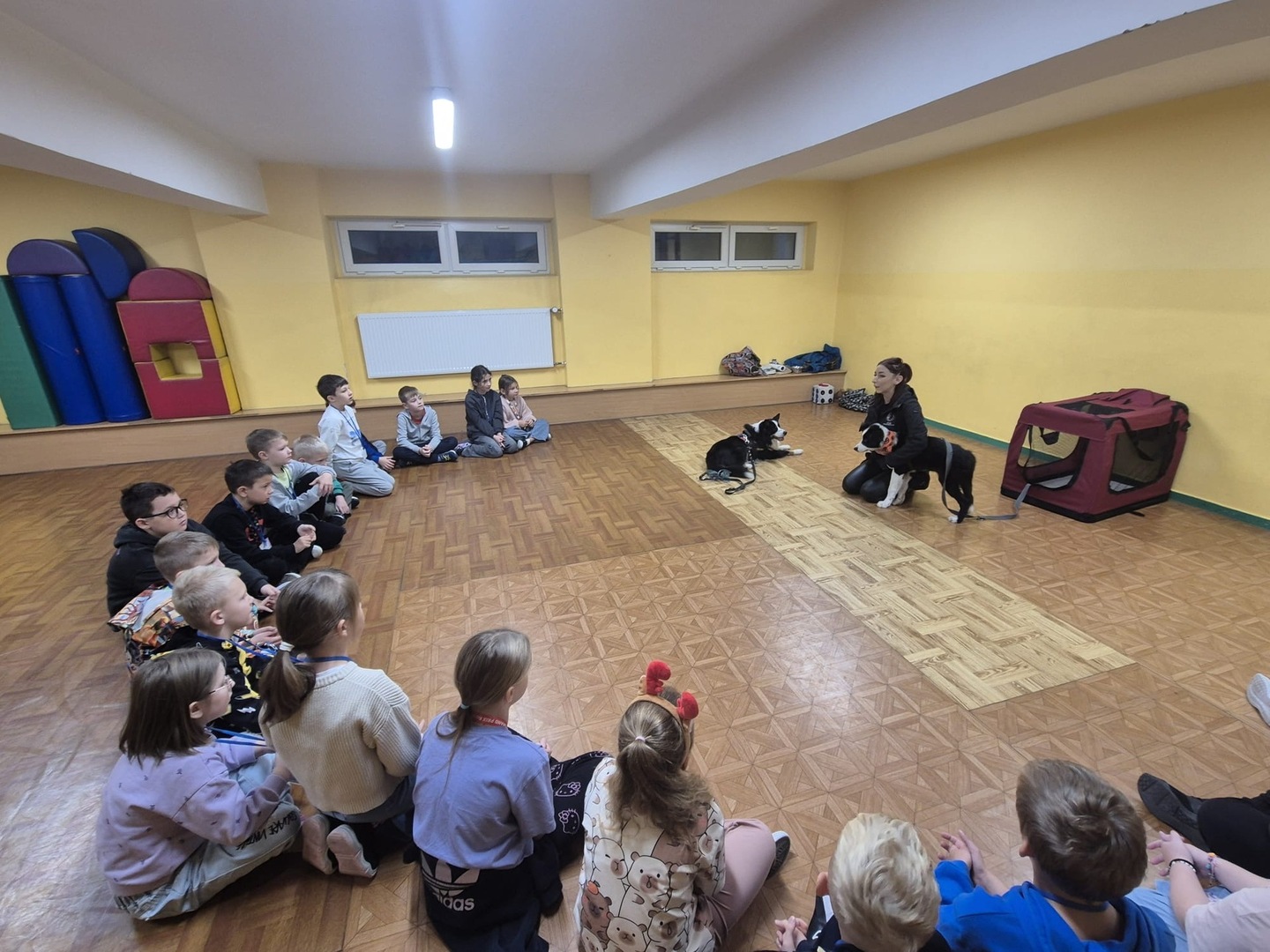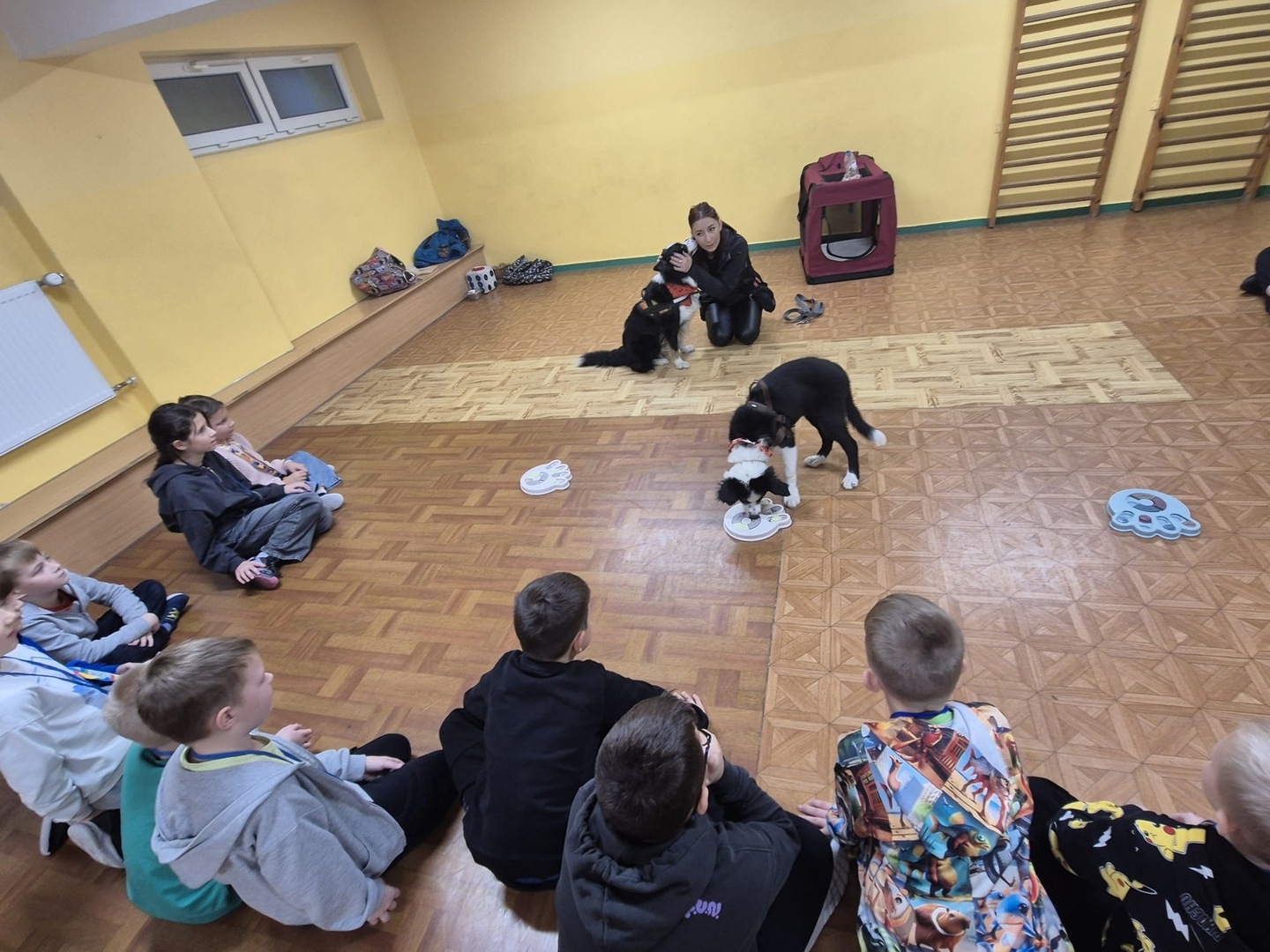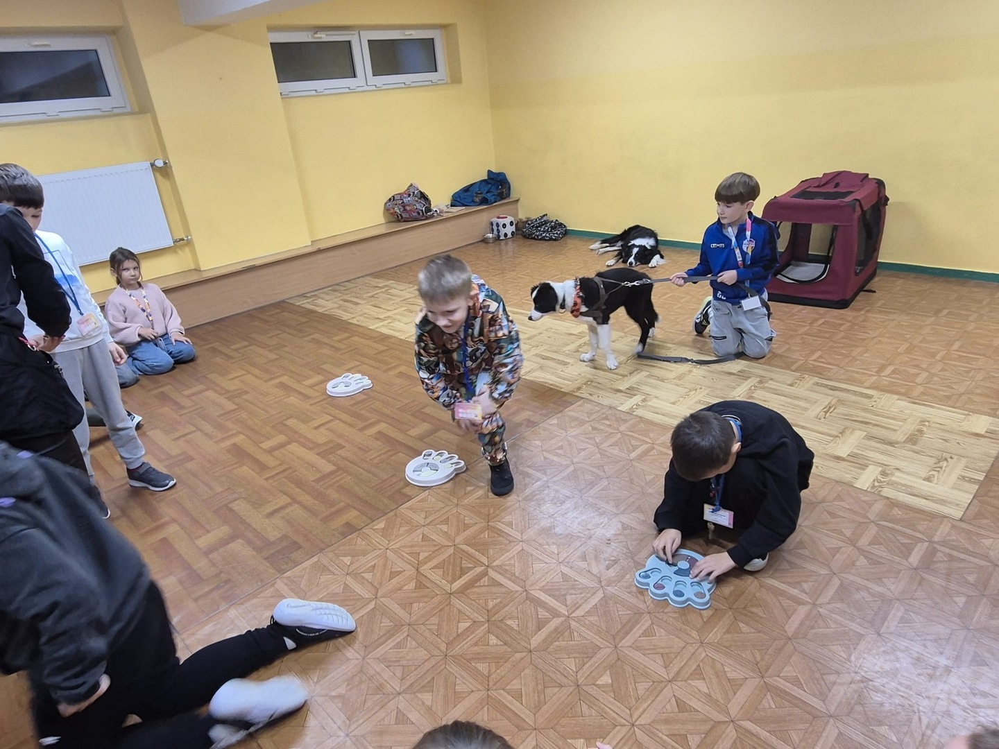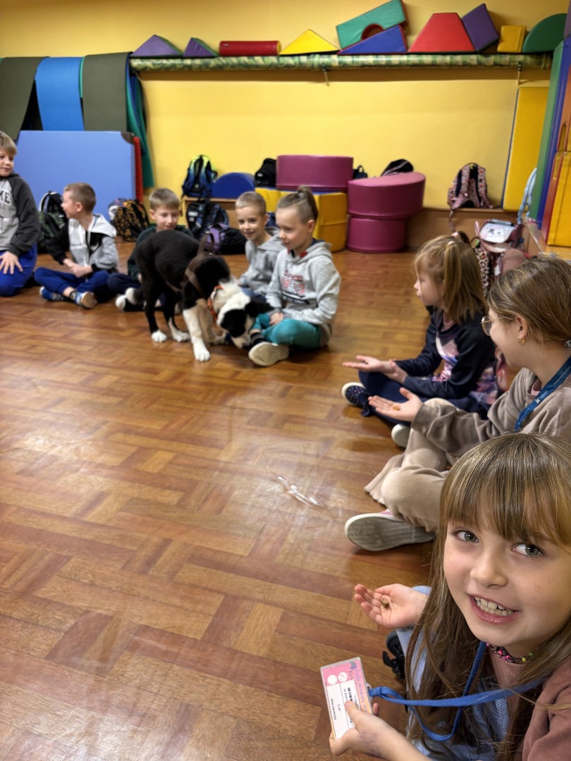 Uczniowie klas drugich wzięli udział w wyjątkowych warsztatach z dogoterapii, podczas których towarzyszyły im dwa przyjazne psy rasy Border Collie – Chilli i Pepper. W trakcie zajęć dzieci poznały różne rasy psów oraz dowiedziały się, jak właściwie opiekować się czworonożnym przyjacielem. Pani Paulina omówiła również zasady bezpiecznego zachowania w sytuacji zagrożenia, na przykład podczas ataku psa. Uczniowie mieli okazję poćwiczyć wydawanie prostych komend, a także zobaczyć, jak działają maty węchowe i dlaczego są ważne dla psów. Warsztaty dostarczyły dzieciom zarówno cennej wiedzy, jak i dużo radości ze wspólnego czasu spędzonego z Chilli i Pepper. Pieski wzbudziły ogromny zachwyt – bardzo spodobały się dzieciom i szybko skradły ich serca.