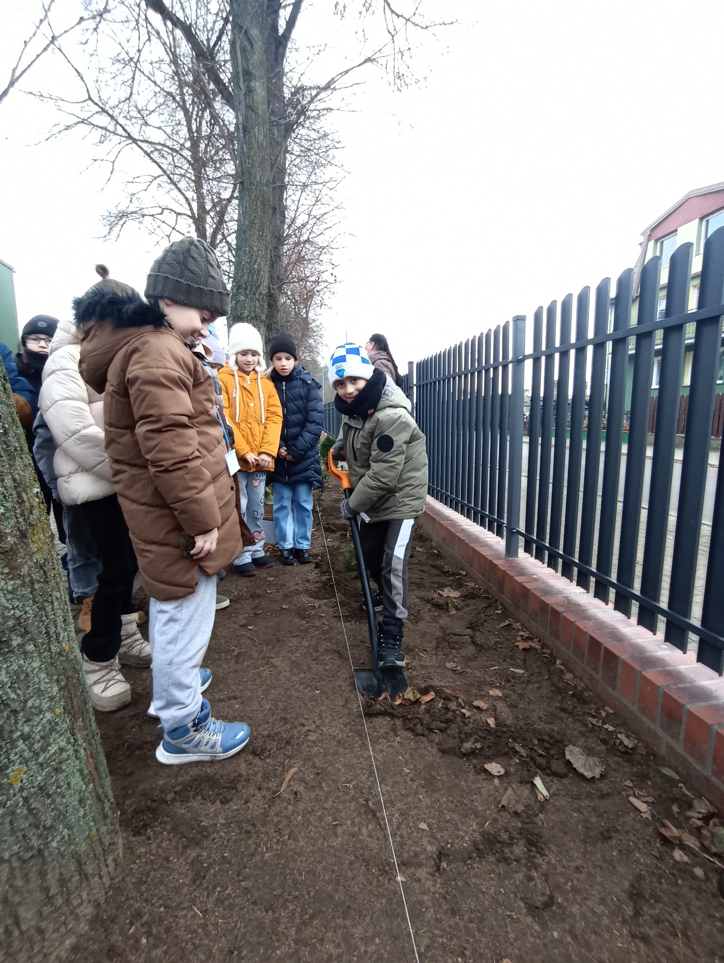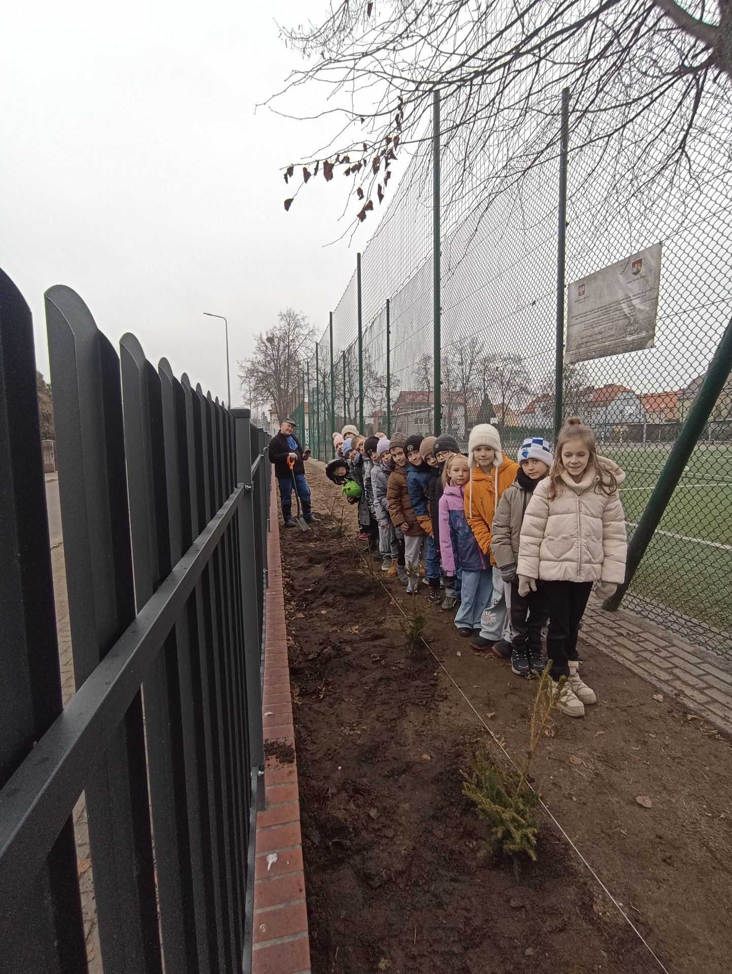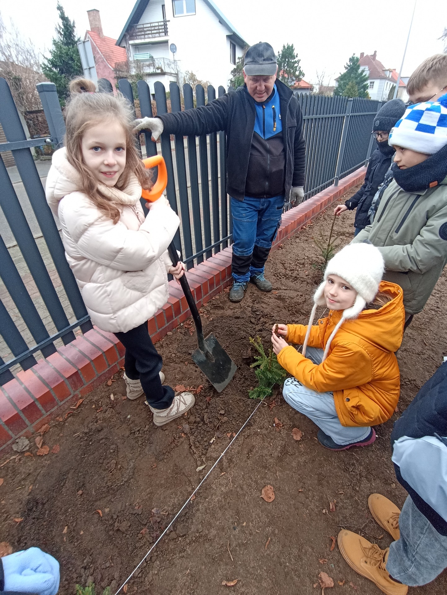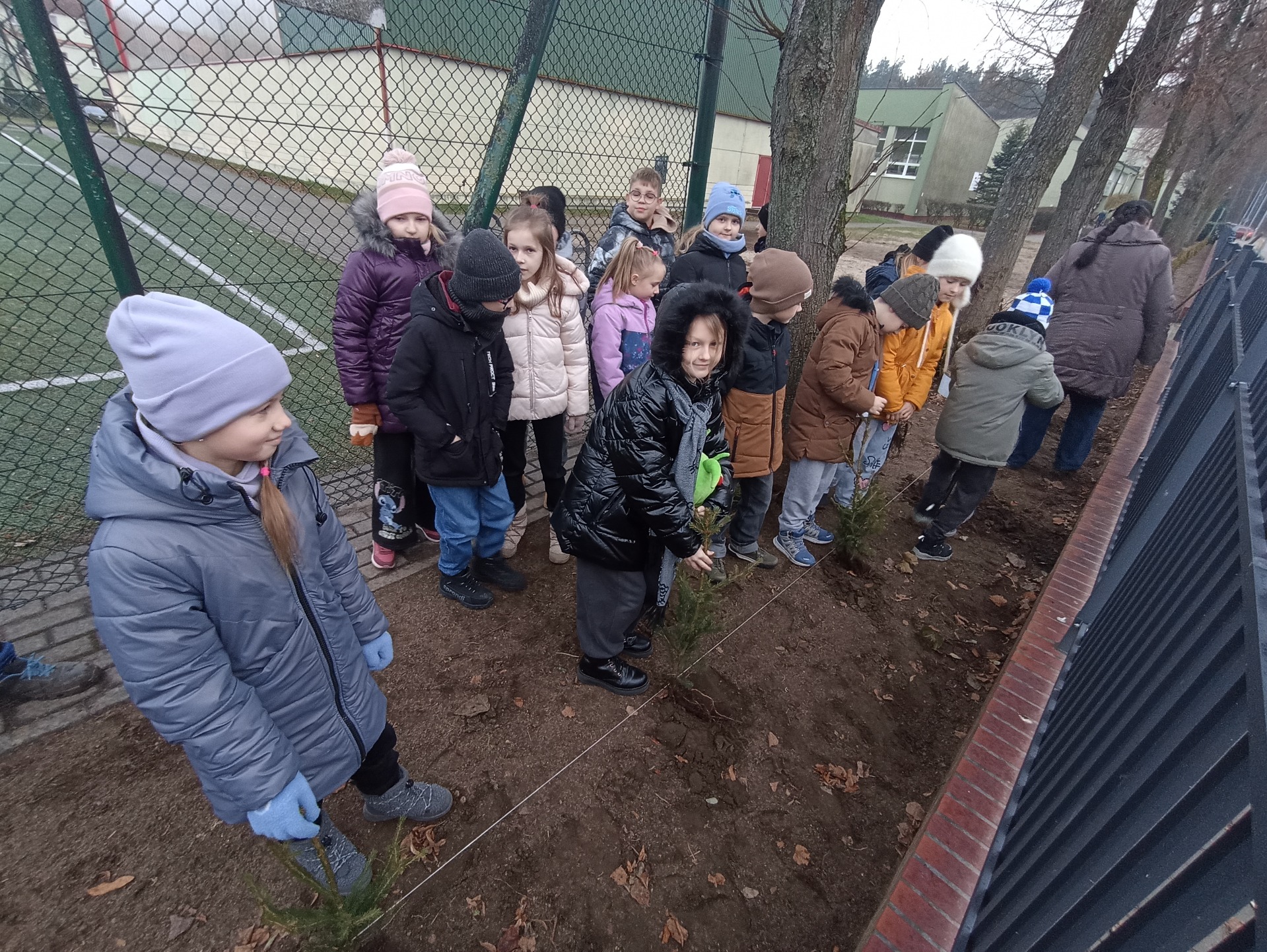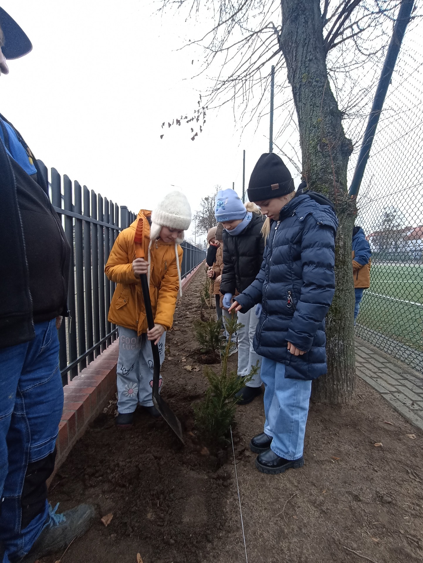 W dniu 04.12.2025 r. uczniowie klasy III a z wychowawcą wzięli udział w akcji sadzenia młodych świerków na terenie przyszkolnym. W wydarzeniu uczestniczył również dyrektor szkoły, rodzic jednej z uczennic oraz szkolny ogrodnik. Celem akcji było zwiększenie terenów zielonych, kształtowanie postaw proekologicznych wśród dzieci oraz integracja uczniów poprzez wspólne działanie. Przed rozpoczęciem prac dzieci wysłuchały krótkiej pogadanki na temat pielęgnacji roślin i znaczenia drzew dla środowiska. Wydarzenie przebiegło w miłej atmosferze, a uczniowie z dużym zaangażowanie uczestniczyli w działaniach.
