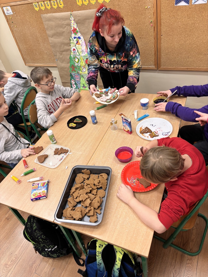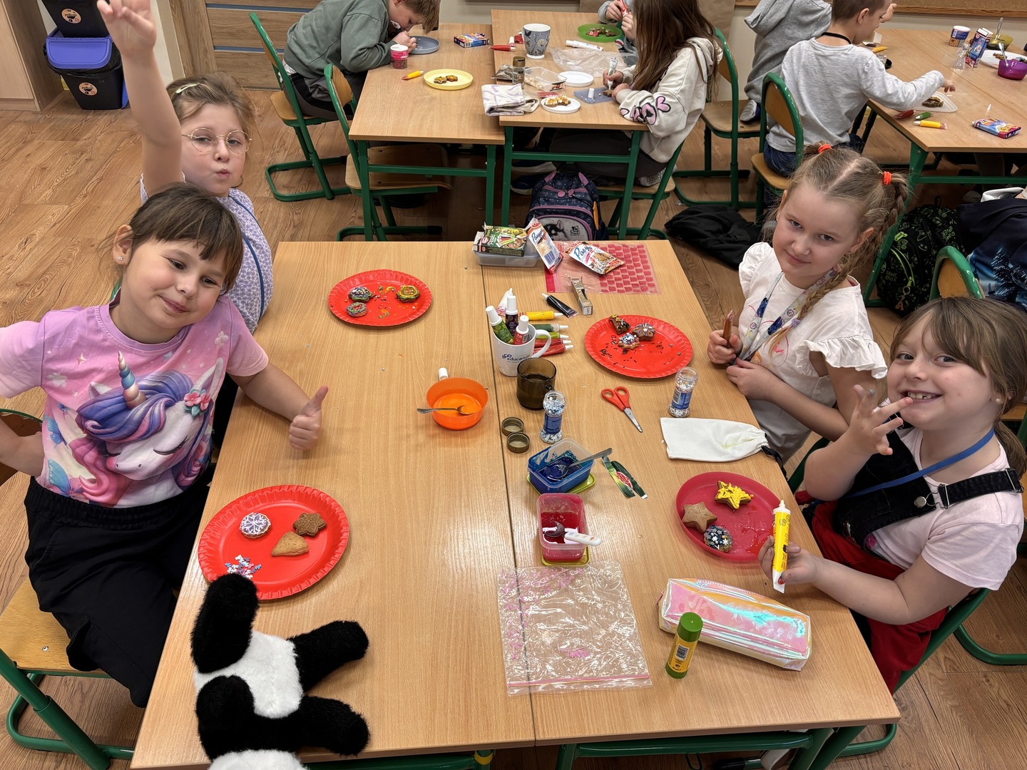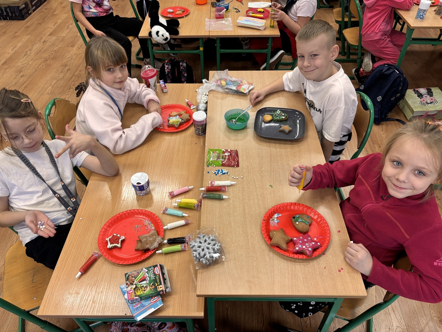 To jednak nie koniec niespodzianek! Aby umilić seniorom świąteczny czas, do kartek dołączono pyszne prezenty. Rodzice uczniów klas 2a oraz 2b upiekli pierniczki, a dzieci pięknie je ozdobiły.